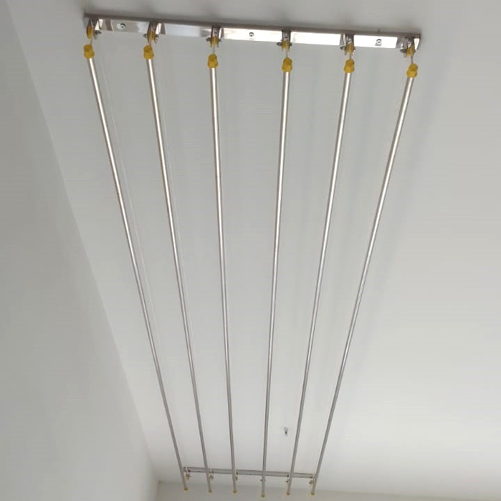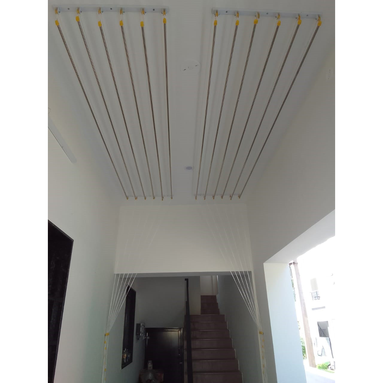 It is a ceiling mounted model for indoor use. It is an individual rod operating system by ropes. It is very easy and smooth in operation. Suitable for Apartments, hostels, individual houses, balcony, portico, sunshade, etc,.